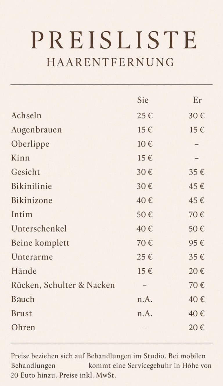 Auf Wunsch unterstütze ich dich außerdem bei der Erstellung deiner Behandlungspreise und einer fundierten Kalkulation – für ein nachhaltiges, wirtschaftlich starkes Angebot in deinem Studio.